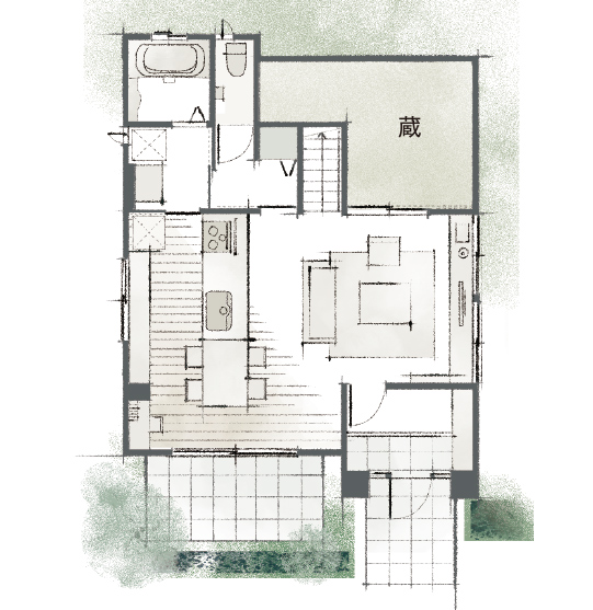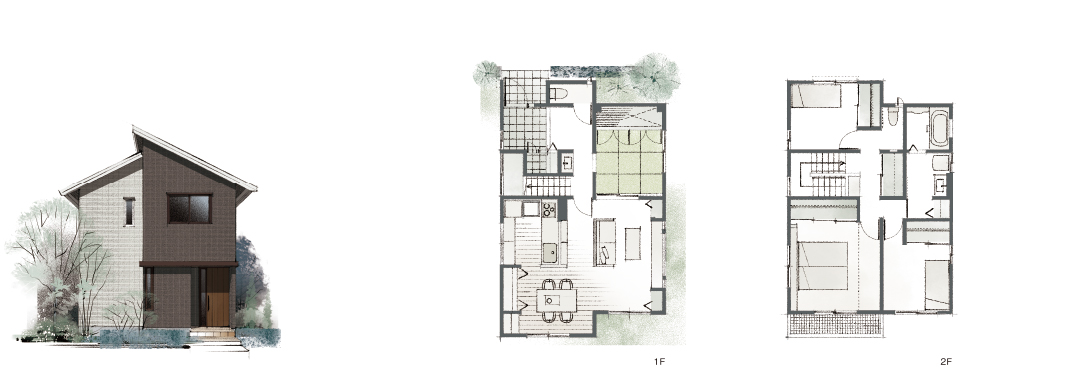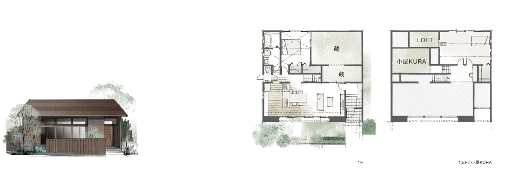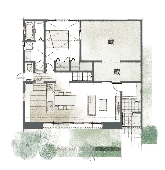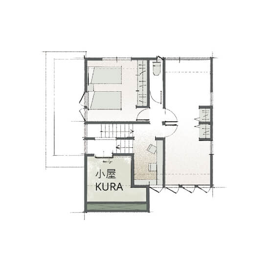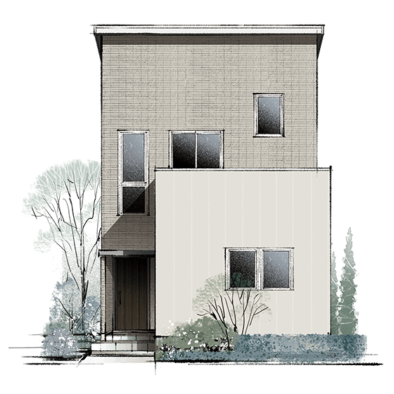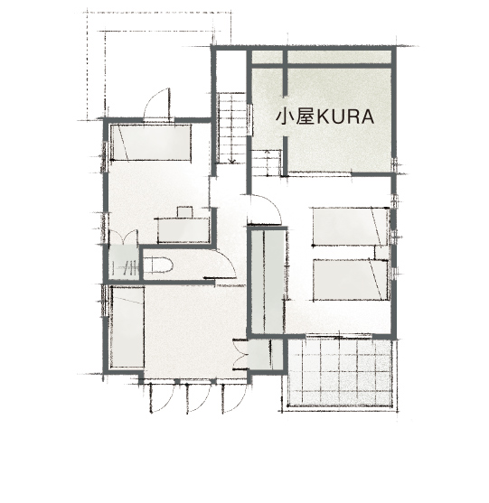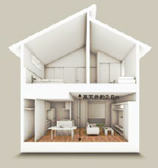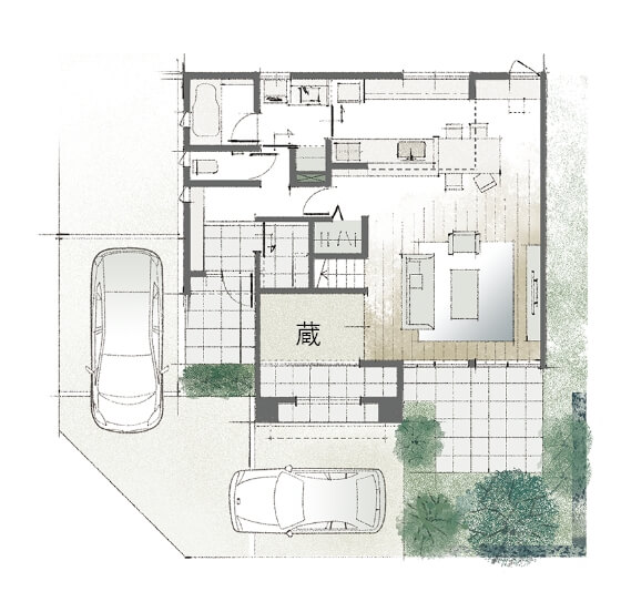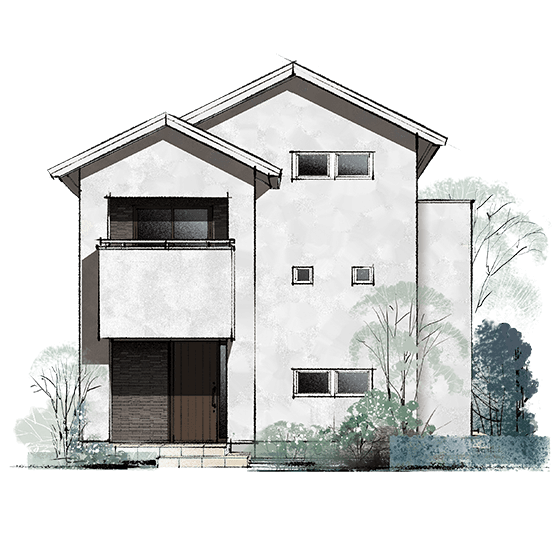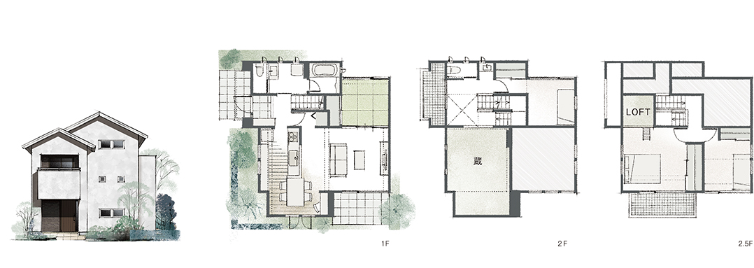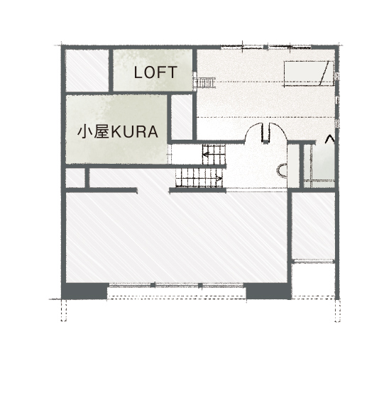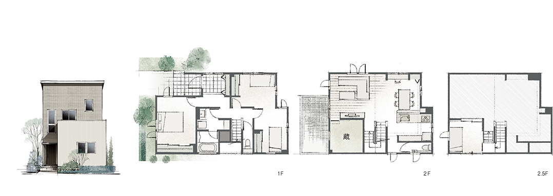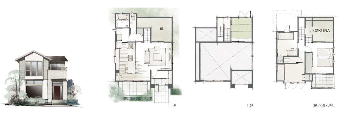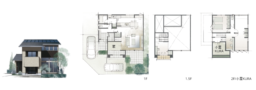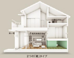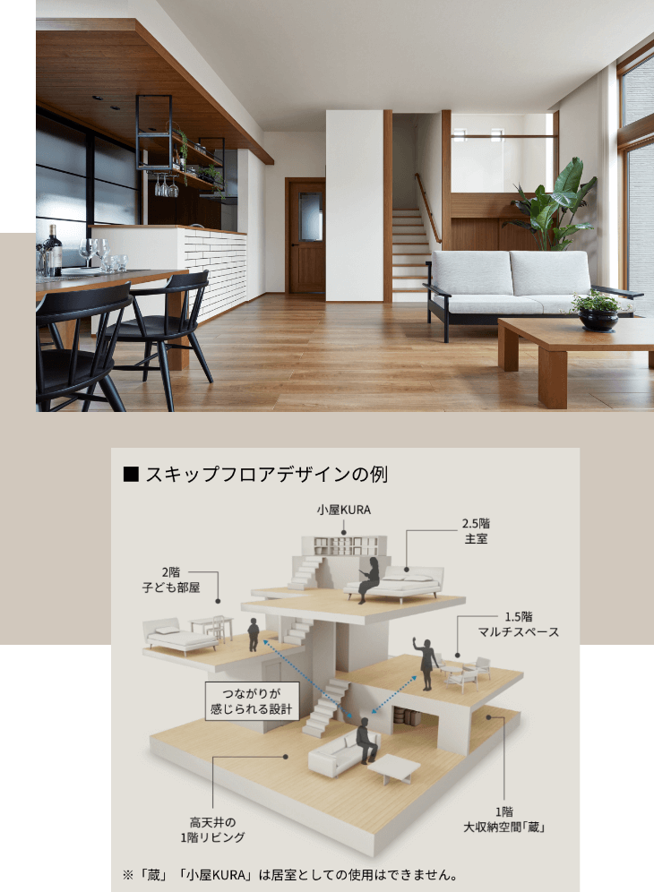 それぞれのフロアには高天井リビングや大収納空間「蔵」、「小屋KURA」を配置できるため、魅力いっぱいの住まいになります。