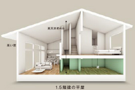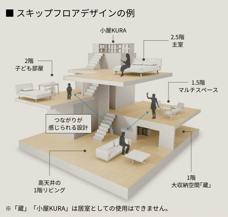 1階→1.5階→2階→2.5階と0.5階刻みでつながる「スキップフロアデザイン」。