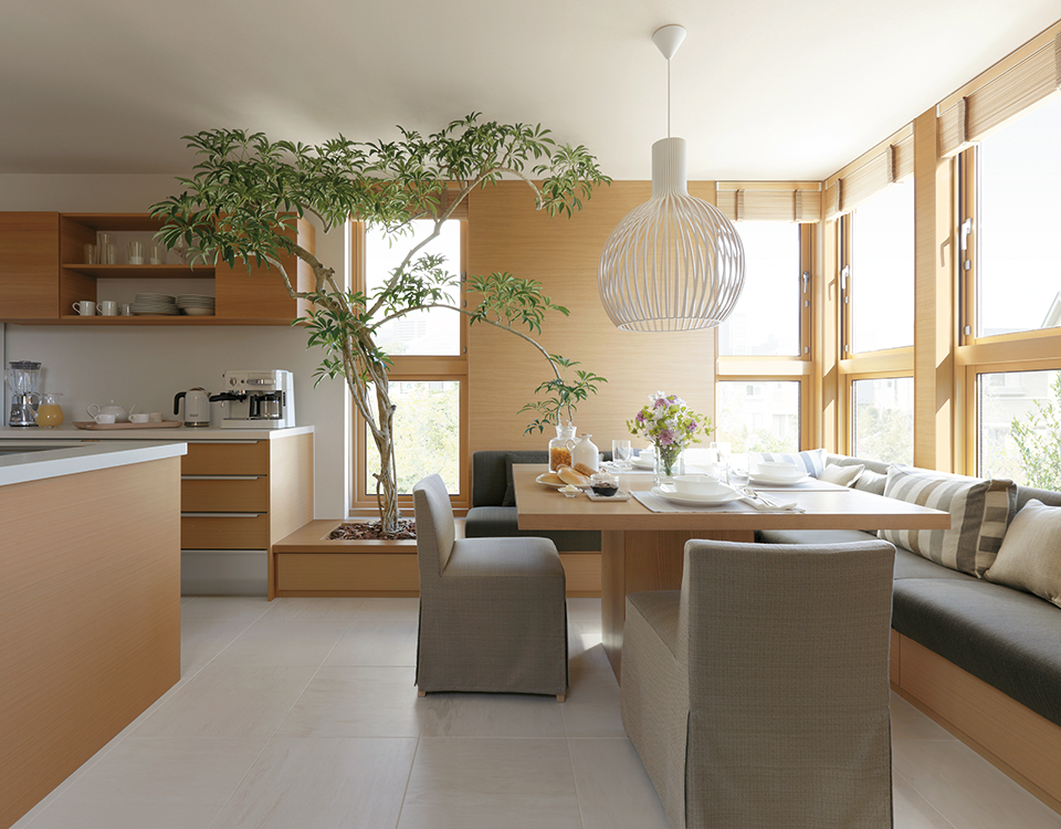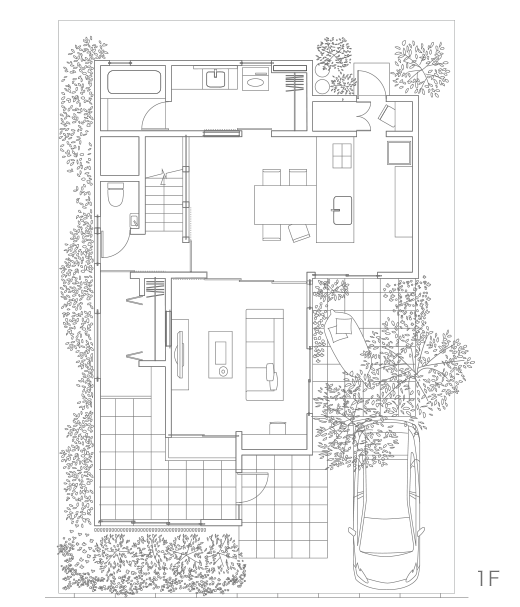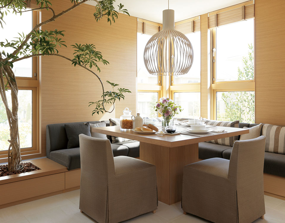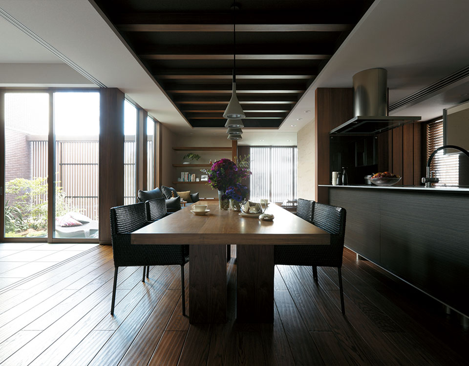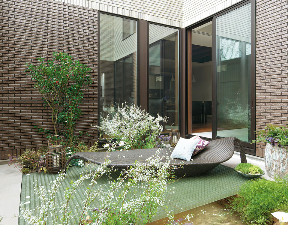 足を止めて、少し立ち寄ってみたくなる。おしゃべりを楽しんで、長居したくなる。そんな「溜り」の場を意図的に設計することで、新しい人と人との新しいふれあいが生まれます。ご近所の方とちょっとしたひとときを楽しめる、外と内の中間にある縁側空間のようなエントランス。ご家族でゆっくりとくつろげる、籠り感のあるダイニング。ほどよく囲まれ感のあるナカ庭は、自然にもっと近づいて暮らせます。