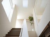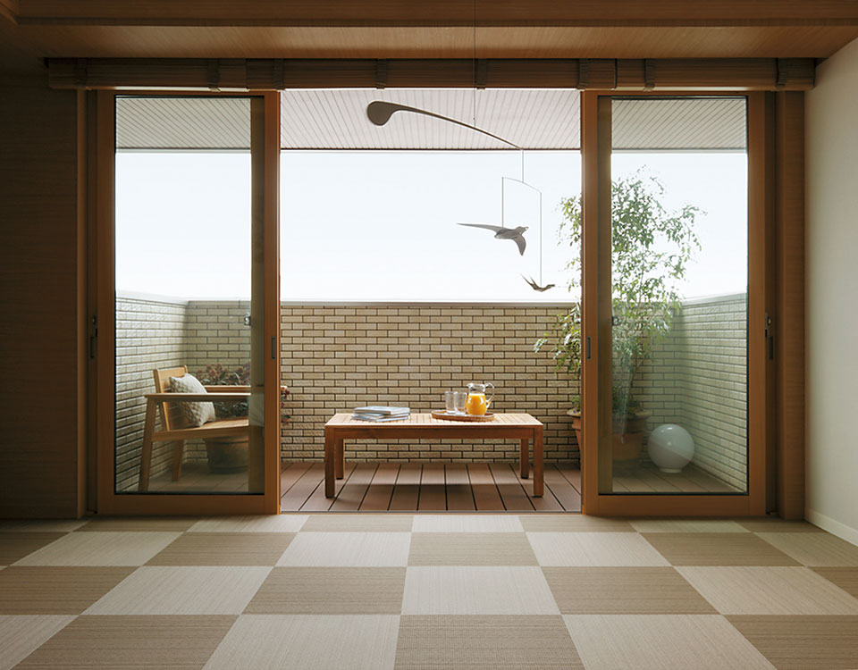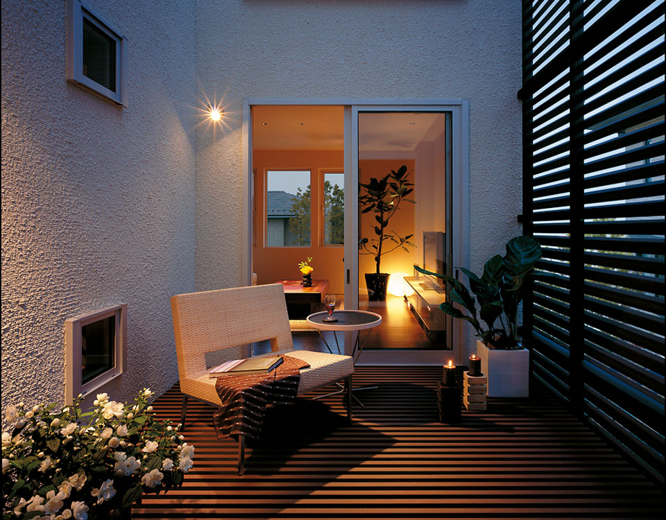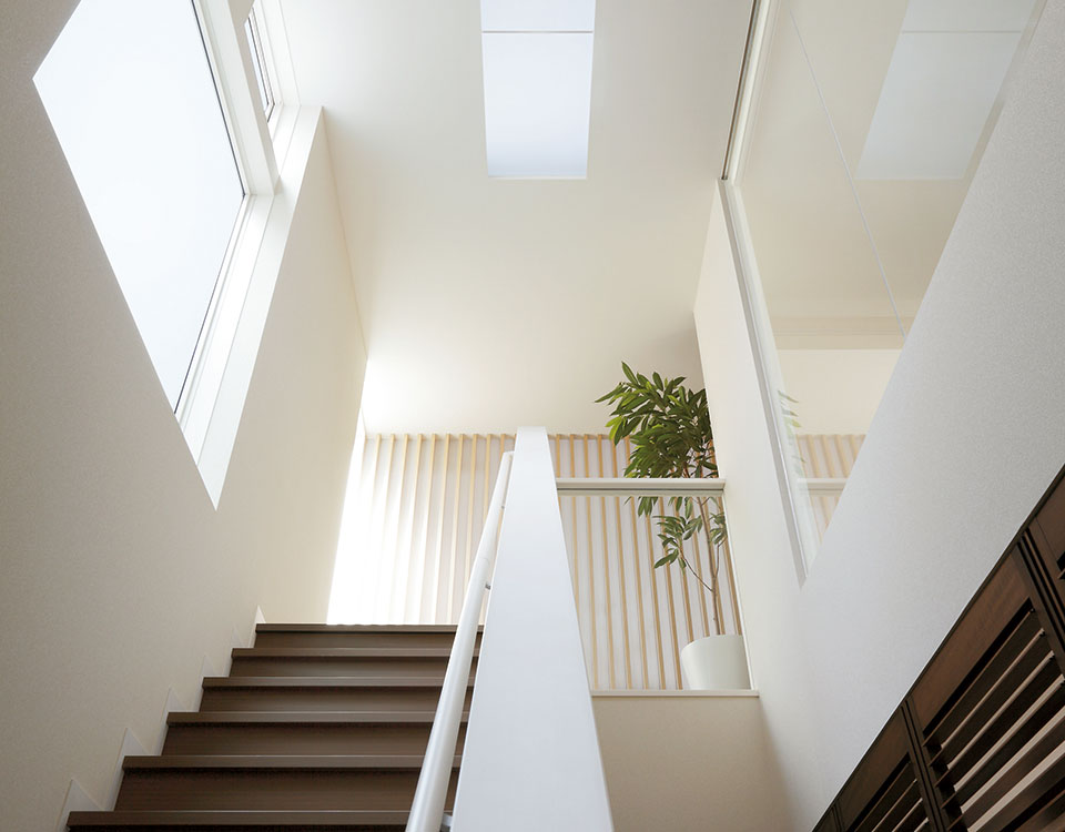 オープンに暮らしたいと思っても、まちの生活はプライバシーや防犯面が不安です。そのため、外に対して閉じた家になってしまいがちでした。そこで、ルーバーやガラスによる「透き」を利用することで、屋内外のつながりをデザイン。室内に採光ができて外の様子もわかり、外からは暮らしがほどよく伝わります。夜は明かりが街路灯の役割を果たし、まちの安心にも貢献。あたたかなコミュニティをデザインします。
