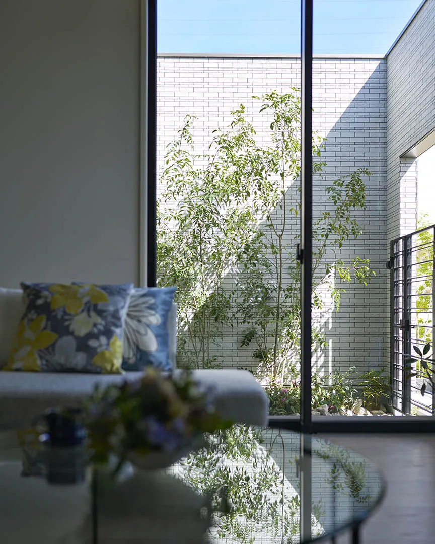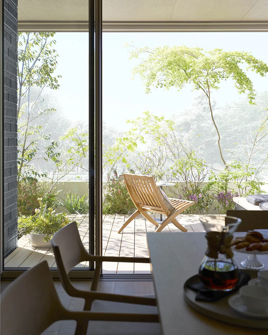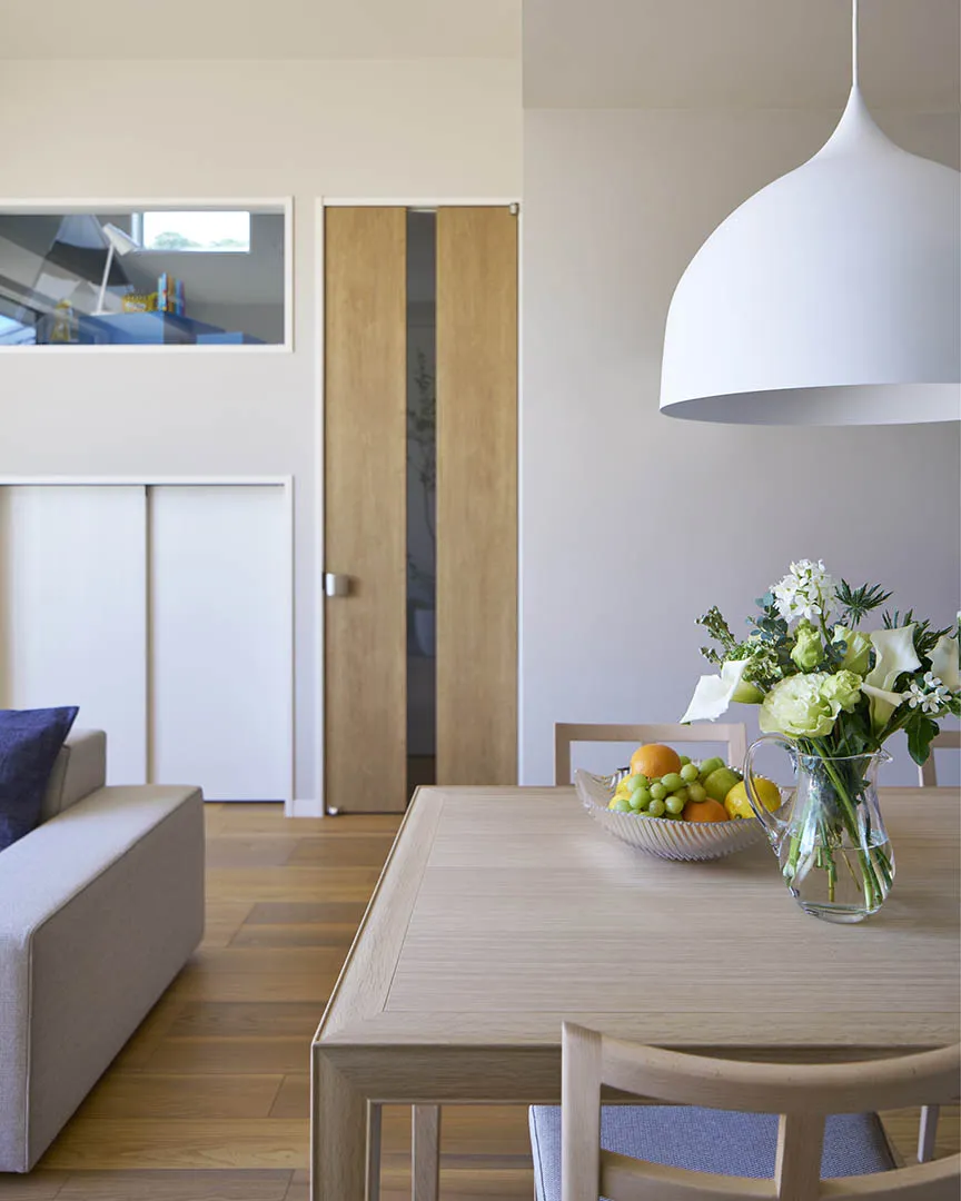 この広く開放的なスペースにご家族のふれあいを深める「コミュニケーション・ハブ(ダイニング・キッチン)」を設け、さらに室内と室外の2つのリビング「デュアルリビング」をデザインしています。