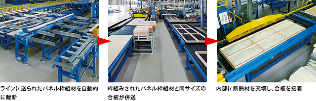 施工現場での作業工数を抑え、施工の安全性向上、効率化、精度向上、工期短縮、コストダウン等を図るため、木質パネルを工場であらかじめ組み立てて大型化するミサワホーム独自の生産システム。