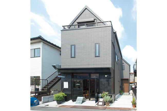 カフェ&レストラン「AllPurpose Seasoning」は店舗併用型の3階建て二世帯住宅である。アンティークグレーのシックな外壁に囲まれた建物に、黒を基調としたファサード。店舗がカジュアルモダンなスタイルにも関わらず、全体として周囲ともしっかりと調和している。