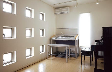 奥さまのピアノ教室をつくることも条件の一つ。音が周囲に漏れにくいように小さな窓を9つ配して、機能もデザインも高めています。生徒さんたちがスムーズに入ってこれる動線にも配慮しました。また、2回の各部屋は勾配天井にし、空間に広がりを持たせたほか主寝室のウォークインクロゼットの引戸には半透明の素材を用いて開放感を演出しています。