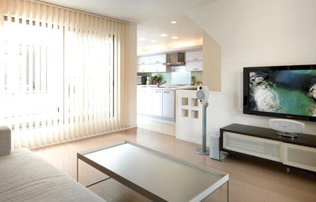 リビングからキッチンの眺め。パティオ形式のルーフバルコニーから明るい光と風が入ります。