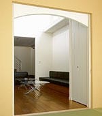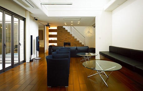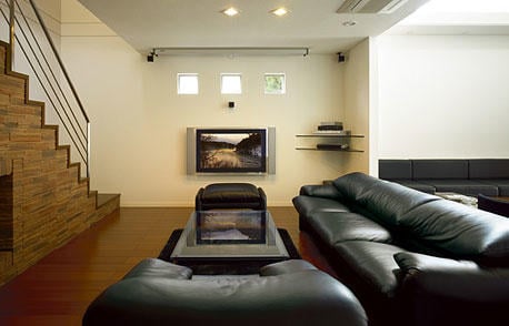 Aさまの住まいがある京都北山は、古都の歴史と新しい文化が交じり合うエリア。そんな街にふさわしい佇まいとするためにシンプルで重厚なコンクリートとベージュの割肌調タイルを組み合わせ、周囲の環境に自然に溶け込みながらも、さりげなく個性を主張する外観デザインとしました。 大きな特徴は、建物のまん中に設けたライトコートと吹き抜け。都会でのプライバシーを守りながら、いかに光と風を取り入れるか。いかに心地よい空間をつくりだせるか。光と、素材の質感や色合いを最大限にいかすことで、ご家族のための上質なライフステージが実現しました。