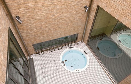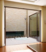 住まいの中央にライトコートを設けたことによって、室内のすみずみにまで自然の光が届くとともに、どこにいても家族の気配が感じられるようになっています。たとえば、2階の部屋からライトコートを介してリビングやダイニングにも視線が届くため、家族のコミュニケーションが自然にはかれます。また、オブジェとしても美しいジャグジーが暮らしを彩るアクセントになっています。