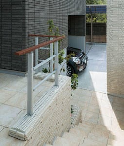 ビルドインガレージから続くアプローチの階段。やわらかい色調がやさしく玄関へ導く。
