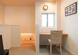 2階のコモンスペースには造り付けのデスクがあり、奥さまが家事コーナーとして活用している。