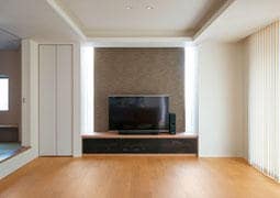 リビングのテレビボードには壁面の両側に明かり取りの窓があり、空間の心地よいアクセントとなっている。