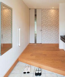 斜めのラインが印象的な玄関には、シューズクロゼットや洗面台が設けられている。