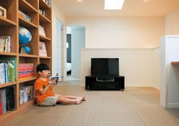 2階は、コモンスペースを中心に、主室と2つの子ども部屋、浴室と洗面所が配置されています。洗濯関連の家事はすべて2階で済ませられるため、動線もコンパクトで効率的とのこと。またコモンスペースは、テキスタイルフロアにしたため、寛ぎやすいと人気です。ライブラリーや家事コーナーもあり、お子さまたちが本を読んだり、ゲームをしたり、思い思いに利用されています。