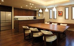 壁面は天然石やウッドパネルで気品高く装飾され、折り上げ天井の間接照明が放つやわらかな灯りが優美な雰囲気を醸し出しています。