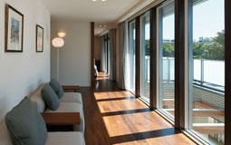 磨りガラスのフェンスで外からの視線を遮りつつ、連続する窓から広がる眺めを大きく採り入れています。