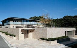 街中の瀟洒な邸宅街で、寄棟屋根を戴いたシンメトリーの佇まいが威風を放つTさまの邸宅。旧道に面した角地であることから、車の往来による騒音やセキュリティを考慮して、建物の周囲を3mのストーン調タイルの塀で囲み、遮音性とプライバシーを高めています。