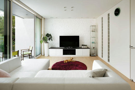 緑豊かな山を背にしてゆったりと気品高くたたずむ白亜のSさま邸。玄関ドアを開けると、ホール正面のガラス壁を通して坪庭や雑木林に視線が抜け、リビングに入ればワイドなサッシから視界いっぱいに大きな芝生の庭園が広がります。