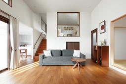 奥さまのお母さまとご同居のHさま邸は、玄関を親子で別々に設け、それ以外は共有にした二世帯住宅である。3.5mの天井高が開放感を生む高天井のリビングは、ご家族の交流の場。リビングがすっきり片付く「1階の蔵」の上には、ロフトの書庫を備えた1.5階の子ども用リビングもある。
