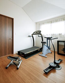一方、子ども部屋は2階に配置し、その上の2.5階をご夫妻のプライベートゾーンに。デスクワークの多いご主人は帰宅後、ホールに設けたトレーニングマシンで運動不足を解消されるのが日課だ。