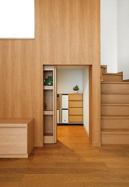 リビングにある一見飾り棚に見える扉は、大収納空間「蔵」への出入り口となる引戸で、「蔵」の上はスキップフロアでモダンな畳スペースになっています。ここはお子さまたちの大好きな遊び場所。ガラスの腰壁越しにリビングにいるパパやママの姿が見えるから、手を振ったり、声を掛けたりと楽しそう。