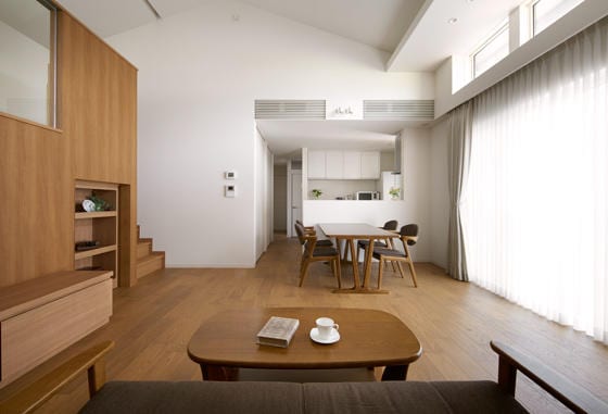木の温もりに満ちたLDKは屋根勾配を生かした吹き抜けの設計で、最高約4mを超える天井が気持ちまで伸びやかにしてくれます。また、全館空調で夏も冬も暑すぎず寒すぎず、自然でちょうどいい温度感。家中どこにいても寒暖差を感じることなく快適に過ごせます。
