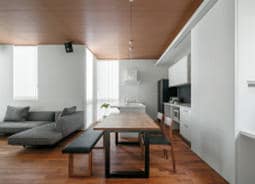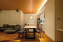 ダイニングキッチンは賑やかに会話をしながら食事が楽しめるよう、天井の間接照明とペンダントライトで明るく演出。リビングは一人でもゆっくりとくつろげるよう、テレビの上のダウンライトだけに絞り、落ち着きがありリラックスできる環境にしています。