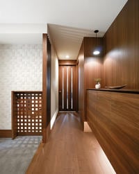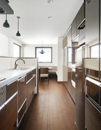 ブナやナラの樹木が豊かに茂る公園の森と向き合うTさまのお住まい。ウォールナット色の床や建具で統一されたLDKは、シンプルながら木の温もりを感じるデザインで、リビングは天井高3.5mの吹き抜けになっています。上下に設けられた二面の窓から陽光がたっぷりと入り、窓に目をやると庭の植栽と森の樹木がひとつに溶け合って一面の緑の眺め。駅から遠くない立地でありながら、まるでリゾート地の別荘にいるかのようです。