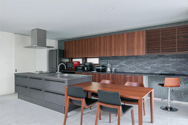 カウンタートップと扉をセラミックの風合いで統一したキッチンは高級家具のよう。デザインタイルの壁や木目の収納と調和して、インテリアを引き立てています。