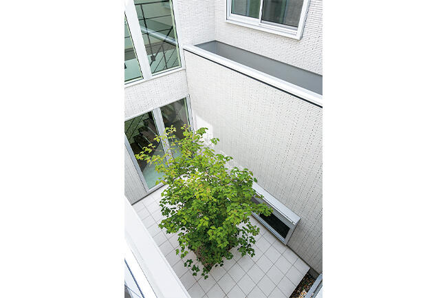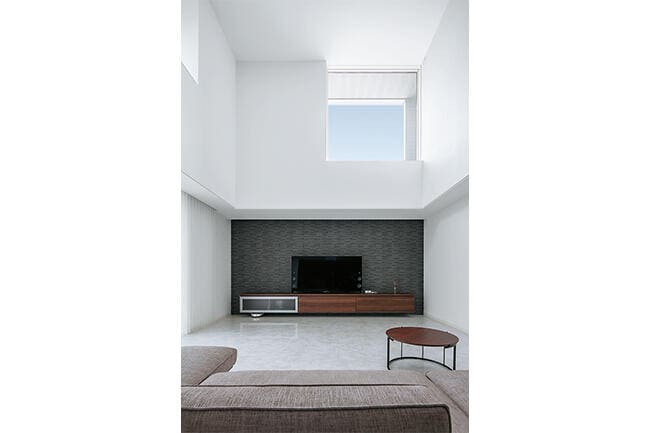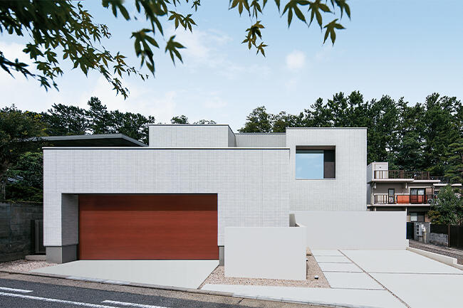 箱を組み合わせたような外観が印象的なSさま邸。玄関をあえて正面から見えない位置に配置、ガレージシャッターと四角い大きな窓のみをアクセントにした佇まいは、まるでモダンアートの美術館のようです。スケルトン階段が走る玄関ホールも、大空間のLDKも、すべて大理石調フロアで美しく統一され、中庭に1本だけ植えられた樹木の緑が「白」の世界に鮮やかな色を添えています。