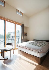 庭に面した1階の大開口の先には、ご主人のこだわりでもあるウッドデッキが施され、室内空間にさらなる広がりを与えています。また、主寝室のウォークインクロゼットには外へ抜けられる「蔵」を併設。その蔵上を和室とし、リビング側に幅広のベンチ階段を設けました。
