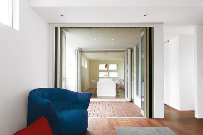 2階のLDKは細長い敷地を生かして、南北に視線が抜ける間取りに。フルオープンの全開口サッシを開けると、ダイニング、バルコニー、リビングが直線でつながります。 「愛犬はバルコニーでひなたぼっこをするのが大好き。春や夏はサッシを開け放つと、心地よく風が通り抜けます」とYさま。近隣からの視線が気になるリビングの東側は、高い位置に3連の窓を配置し、都心の住宅密集地でありながら、明るく開放感に満ちた暮らしを実現しました。