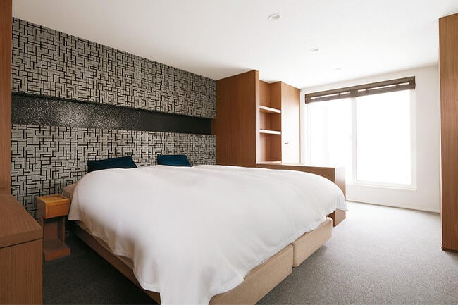 幾何学模様のシックなクロスが素敵な主寝室。カーペットの床で落ち着きを。