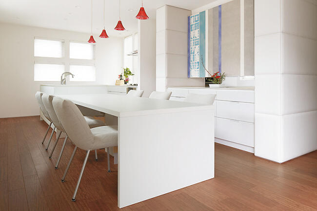 ダイニングキッチンのインテリアにもこだわりが光ります。白ですっきりと統一した空間は、レザー調のクッションウォールで柔らかみを生み出し、赤いガラスのペンダント照明を鮮やかな差し色に。ガラス照明はバカラ製で、奥さまが一目惚れされたもの。「この赤を生かすコーディネートをお願いしました。タペストリーのような和紙染めのクロスも素敵でしょう?設計士の廣瀬さんがデザインしてくれました」と奥さま。