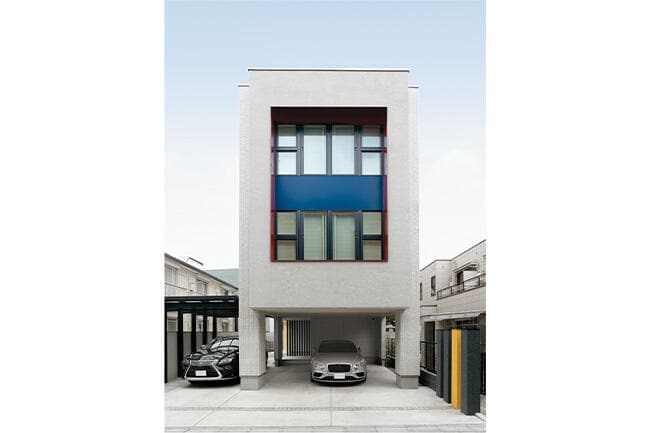 ビジネスにも便利な都心エリアに、Yさまが建てられたのはオフィス併用の3階建て住宅。ブルーの壁や赤のラインを効かせた外観デザインは、まるでモダンアートのよう。オフィスの玄関ポーチには黄色を用い、Yさまのお好きな赤・青・黄の3色でポップに演出しています。