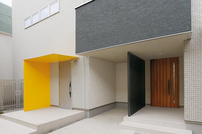 自宅玄関の並びにオフィスの玄関を配置。オフィスの玄関ポーチは、側面壁と庇を鮮やかな黄色で個性的に。