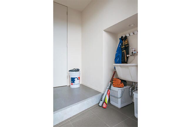 野球一家ならではの生活動線の工夫も見逃せません。洗面・浴室の横に設けたプライベート玄関に、ユニフォームの泥が洗い流せるスロップシンクを設置。汚れたユニフォームをここで脱いでお風呂に直行し、着替えてからリビングへ。「家の中が汚れないから、ストレスが溜まりません」と奥さまはうれしそうです。