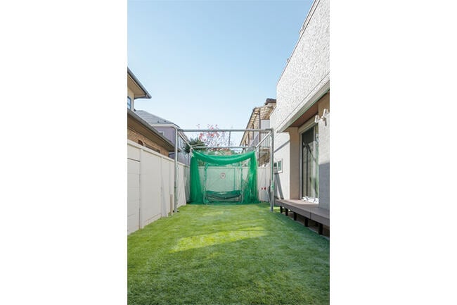「子ども達がいつでもバットとボールに触れられる環境の住まいづくりが夢でした」とKさま。その言葉通り、ガレージの奥には野球の練習ができる人工芝の広い庭が設けられ、リビングからもダイニングやキッチンからもお子さまの練習姿が見守れます。おおらかなお人柄のKさまは、この庭をお子さまの友達にも開放されているので、いつも大勢の子ども達が集まり、賑やかで楽しそう。