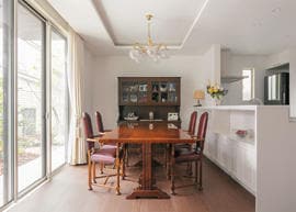 ご愛用のクラシック家具や美術品が住空間にバランスよく映えるよう、あらかじめ配置する場所を想定してプランニング。内装は白を基調に、主張しないデザインでシンプルに仕上げています。リビングやダイニングの天井に組み込まれた間接照明が優しい灯りで空間を彩ります。