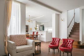 リビングの中で存在感を放つ赤革のミニチェアは、スペインの高級ブランド、バロッサバレンティのもの。