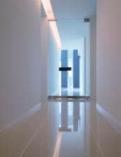 またパブリックスペースの床は大理石の硬い材質で覆われていますが、2階への階段はカーペット。ソファやチェアも布製で、あたたかさを演出しています。