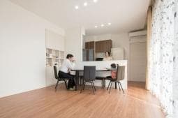 ペニンシュラタイプのダイニングキッチンは奥さまのお気に入り。キッチンの後ろにはスライドドアの壁面収納があり、家電や食器類、冷蔵庫もすべてここに収まっています。「この収納のおかげで、苦労しなくてもキッチンまわりがすっきりときれいに保てるのがうれしいですね。ふいの来客時にもサッと片付けられてとても便利です」と顔をほころばせます。