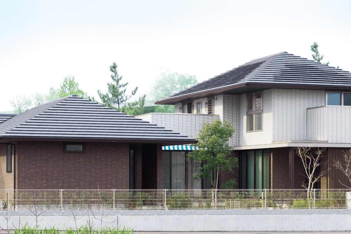 高松市の郊外で、ひときわ目を引く和モダンな佇まいのMさま邸。2階建ての子世帯と平屋の親世帯が中庭を挟んでコの字につながる二世帯住宅で、南北に長い敷地を上手に活用して美しいバランスで配置されています。