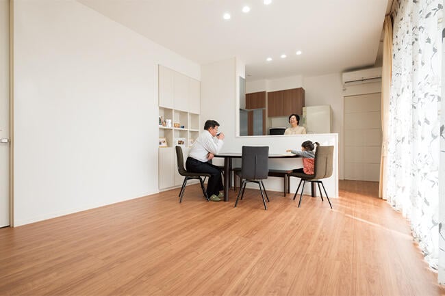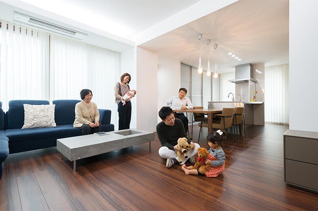今日も楽しそうに廊下を走って、「大好きなおじいちゃんとおばあちゃんの部屋」に向かうお子さま。 お二人目が誕生したばかりの奥さまは、その様子に目を細めながら、「産休が明けたら仕事に復帰するのですが、両親に子どもの面倒を見てもらえるので助かります」と語ります。一方、ご両親は「孫とお絵かきしたり、歌ったり踊ったり、いろんなことをさせてくれるので、毎日変化があって楽しいですね」とにっこり。 両世帯がほどよい距離感を保ちながら温かく交流し、お子さんの成長を一緒に見守る暮らし。理想の二世帯同居のカタチがここにありました。