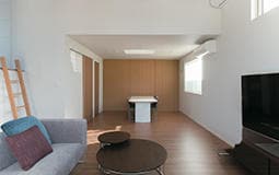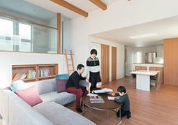 「蔵」の上はリビングを見下ろす和モダンな畳の間。透明な合わせガラスの手すり壁を通してLDKとつながり、視覚的にも広がりを生んでいます。畳の間へは外の階段から直接出入りできるだけでなく、リビングからハシゴでも登れるので、お子さまの格好の遊び場に。ガラスの手すりの手前の引き戸を閉めると個室になり、客間としても使えて便利です。