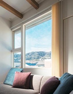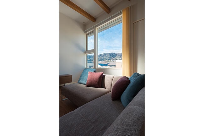2階に伸びやかに設けたLDKは、リビングスペースの天井が吹き抜け風に高くなった設計で、ひときわの開放感。天井に走る4本の梁が住空間に木の温もりを加えています。そして訪れた人の誰もが目を見張り、感嘆するのが、北側の大きな窓から広がる六甲山の美しい眺望です。 「デザインアドバイザーの方が提案してくださったのですが、これほど素晴らしい景観が得られるとは思っていなかったので、想像以上の感動でした。まさに我が家のシンボル。ソファに座って山を眺めていると気持ちも穏やかになります」とNさまは語ります。