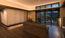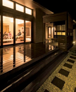 ダークな色合いの床や建具と、珪藻土(けいそうど)のコテ塗り壁が調和し、間接照明のやわらかな灯りが優美なムードを醸し出しています。