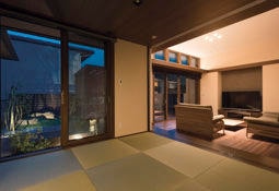 リビングの一画にしつらえたモダンな和室は、障子を開け放てばひと続きの大空間になり、大勢のご友人が思い思いの場所でゆったりとくつろげます。和室の窓から眺めたときは庭が和風に見えるよう、植栽や庭石に趣向が凝らされていました。