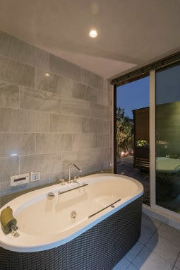 もうひとつ、とっておきのリゾート感を味わえるのが、お風呂好きのKさまの夢を叶えた浴室です。インテリアのような美しいデザインの浴槽に浸かりながら、庭の眺めを楽しむバスタイムは至福のひととき。