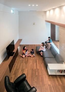 三人のお子さまがいらっしゃるにも関わらず生活感の漂わない暮らしが維持できるのは、収納の工夫があればこそ。リビングには大収納空間「蔵」を備え、その上を和モダンな畳コーナーに活用。散らかりがちなオモチャやかさばる調度品も「蔵」にしまえて便利です。