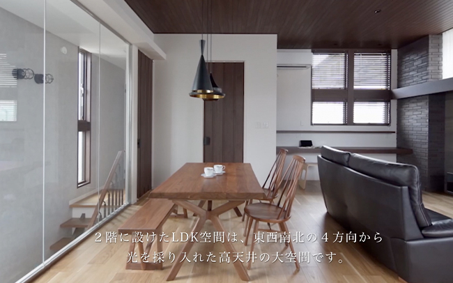 2階に広がる高天井のLDKは、住宅密集地でありながら光に満ちた暮らしができる配慮が施されています。隣家が迫る南側はアクセント壁で閉じて外からの視線を遮り、高天井近くに配した窓から採光。一方、北側の階段に面した壁はガラス張りにしてリビングに広がりを出すとともに、階段の窓からも穏やかな光を取り込んでいます。ダークな板張り天井やタイル張りの柱壁、黒のキッチンなどで構成した重厚感のある内装ながら、明るく開放的な印象で重さを感じないのはこうした工夫があるからでしょう。「階段の照明は、玄関ホールに誰かが入ると人感センサーで点灯するので、2階リビングにいても子どもが帰宅したのがわかり、『お帰り!』と声をかけられます」とSさま。 また、室内干しができる広い洗面所も2階東側に配置し、外干し用のバルコニーや収納を設けて、「洗う・干す・畳む・しまう」をスムーズに。上下階の移動なく、2階で生活が完結できるのも便利です。西側のガレージの上に設けたもうひとつの広いバルコニーは、LDKの延長として使える憩いの場。週末はテーブルを出して家族でバーベキューを楽しまれているそう。「夏はここでビールを飲んだり、プールを出して子どもに水遊びをさせています。屋根があるので、直射日光が当たらず快適ですね。コロナ禍で自粛生活をしていても、家の中に遊び場があるからストレスが溜まりません」とSさま。その笑顔が満足感を物語っていました。