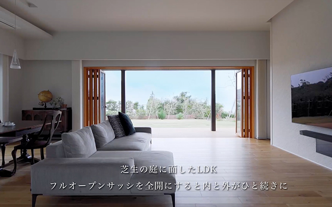 海を望む風光明媚な丘の上に、スケール感あるスクエアなゲート壁が気品高く映えるTさま邸。3m超の天井がゆとりを生むLDKには東西に風情の異なる庭があり、両サイドに視線が抜けます。